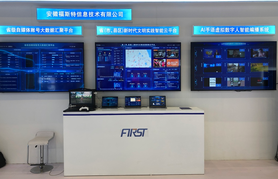 安徽福斯特信息技術(shù)有限公司此次應(yīng)邀參展,以廣電媒體發(fā)展為亮點(diǎn),集中展示大數(shù)據(jù)、人工智能,呈現(xiàn)了AI-VLOG視頻智能合成系統(tǒng)+AI手語(yǔ)虛擬數(shù)字人智能編播系統(tǒng)+省級(jí)自媒體賬號(hào)大數(shù)據(jù)匯聚平臺(tái)+?。ㄊ?、縣區(qū))新時(shí)代文明實(shí)踐智能云平臺(tái)技術(shù)。
